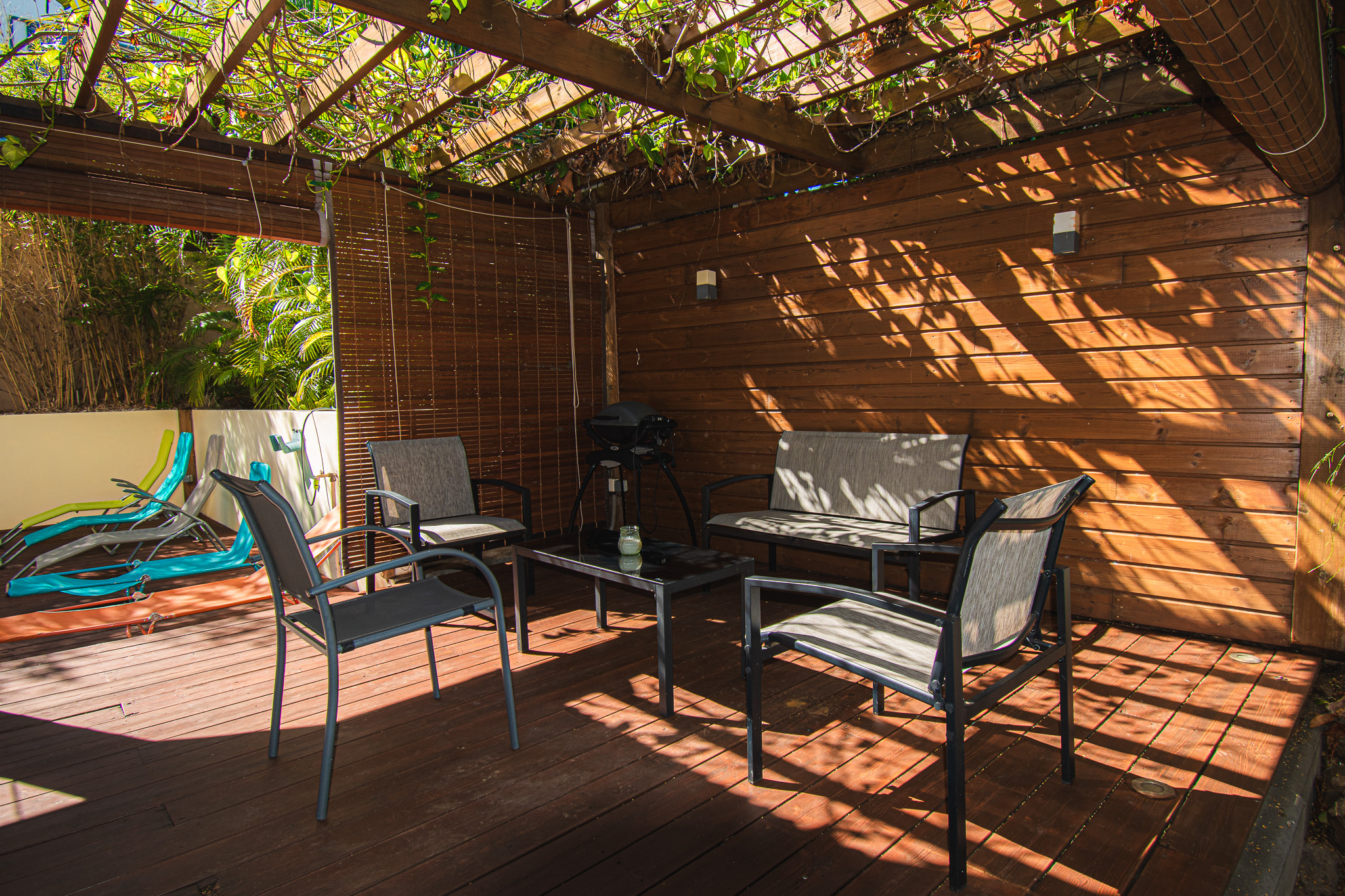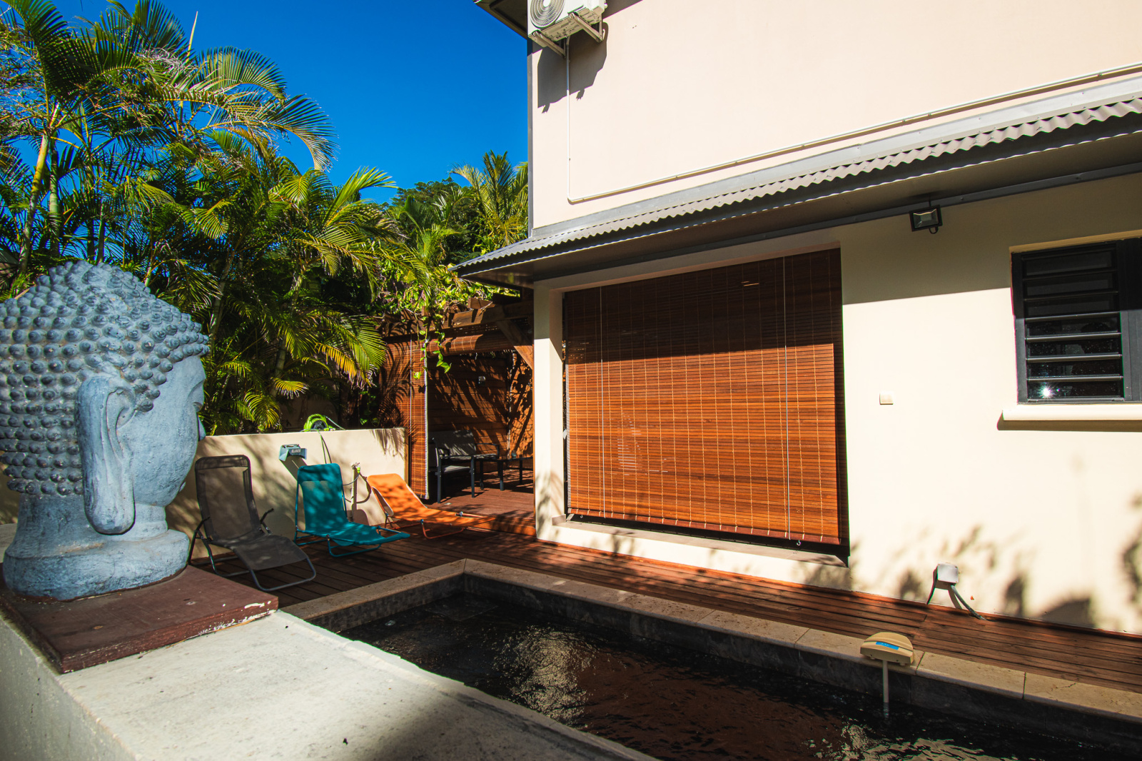 Extérieur "Détente" : Profitez d'une belle varangue aménagée avec salon de jardin, s'ouvrant sur une piscine privée pour vos bains de soleil et vos soirées d'été.